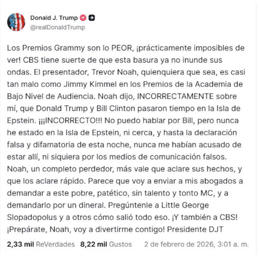 El presidente Trump no tardó en utilizar su red social, Truth Social, para descargar su ira contra la 68ª edición de los Premios Grammy. El mandatario calificó la ceremonia como "lo PEOR, prácticamente imposible de ver" y dirigió sus ataques hacia el presentador, Trevor Noah.