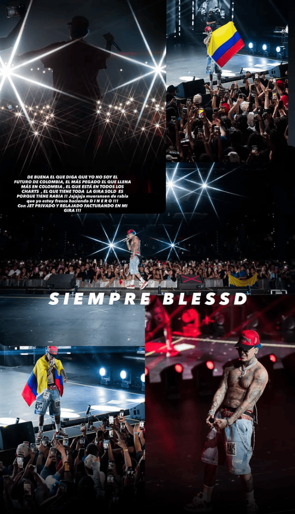 Horas después del espectáculo de Karol G en Coachella, Blessd publicó en sus historias de Instagram un mensaje que algunos han interpretado como una reacción al protagonismo ajeno. "De bueno, el que diga que yo no soy el futuro de Colombia, el más pegado, el que llena más en Colombia, el que está en todos los charts, el que tiene toda la gira sold out es porque tiene rabia", escribió el cantante, acompañando el texto con imágenes de sus conciertos en Estados Unidos.